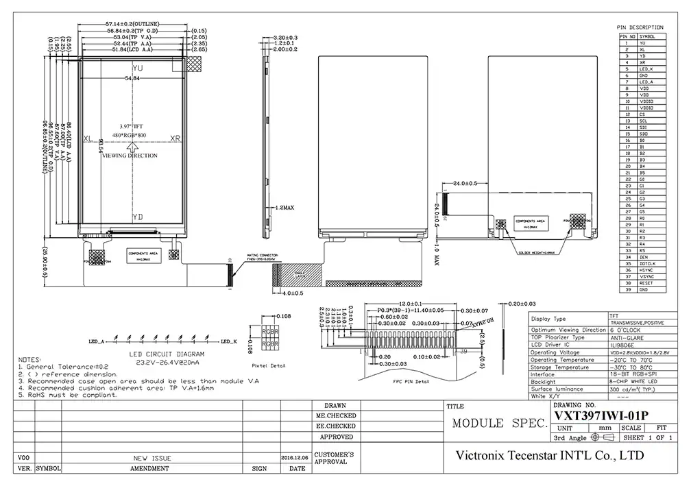 TFT LCD is a type of liquid crystal display that utilizes thin-film transistor technology to enhance image quality, and it has numerous applications in everyday life. As a professional TFT module manufacturer and supplier in China, what makes the Victronix 3.97 inch 480x800 Resistive Touch TFT Module different from other manufacturers? At first, it offers a typical brightness of 300 cd/m² and a contrast ratio of 500:1, ensuring excellent readability from various angles. Secondly, it integrates a backlight unit utilizing 8-LED white with a typical lifetime from 30,000 to 50,000 hours (to 50% initial brightness), ensuring clear visibility in all lighting conditions. Besides, it features an 18-bit parallel RGB interface and SPI control (CS, SCL, SDI, SDO) for flexible system integration. Additionally, its reliable 4-wire resistive touch panel (pins: YU, XL, YD, XR) ensures accurate input with a linearity error of ≤2.5%. In addition, it passes rigorous environmental testing, including high/low temp operation/storage, humidity, thermal shock, vibration, ESD ±4kV air, ensuring it can operate seamlessly across an extended temperature range (-20°C to +70°C).